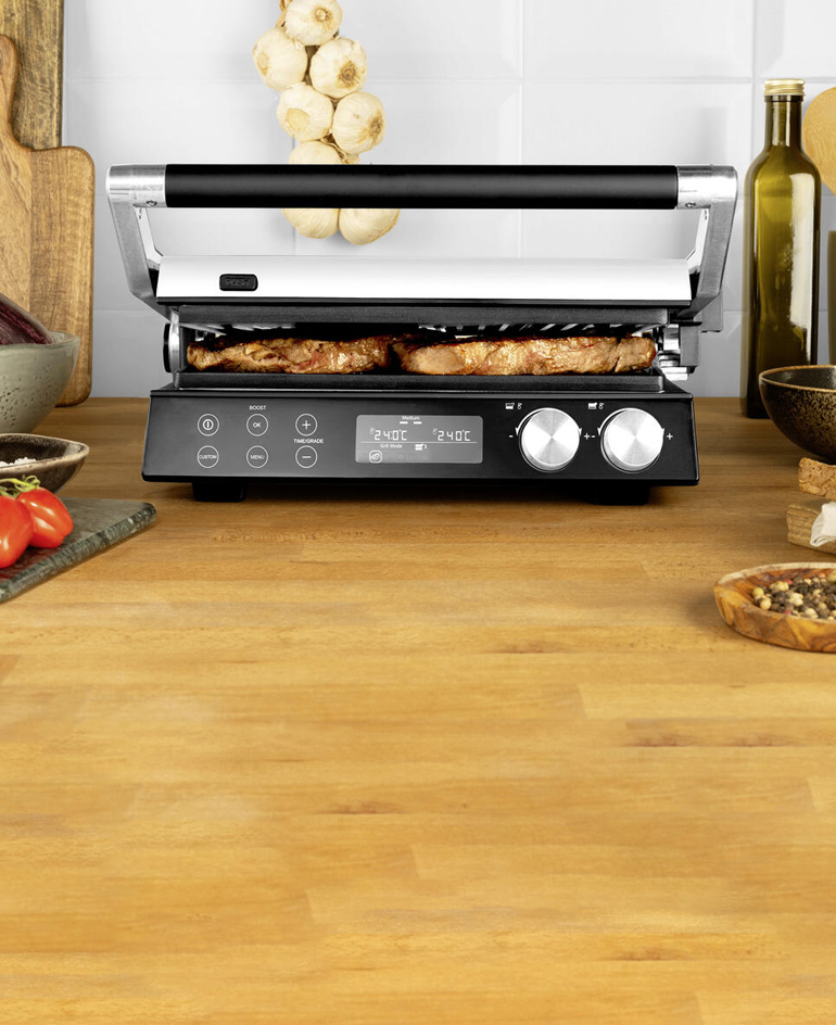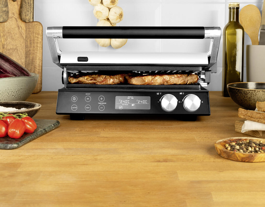 4-in-1 Multitalent: Kontakt- und Tischgrill, Sandwich-­Maker und Waffeleisen in einem.
