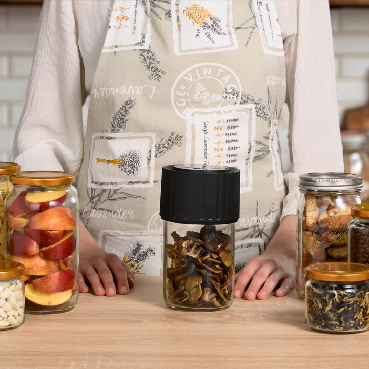 Aufgeschnittenes Obst oder Gemüse, die Reste vom gekochten Abendessen, Trockenvorräte wie Haferflocken, Reis, Nüsse, Teeblätter, Kaffeebohnen, ... – eigentlich alles, was ins Glas passt, kann vakuumiert und mit nur einem Knopfdruck bis zu 5-mal länger haltbar gemacht werden. Die vakuumierte Aufbewahrung erhält Aroma und Nährstoffe, schützt vor Feuchtigkeit, Keimen und Schädlingen.